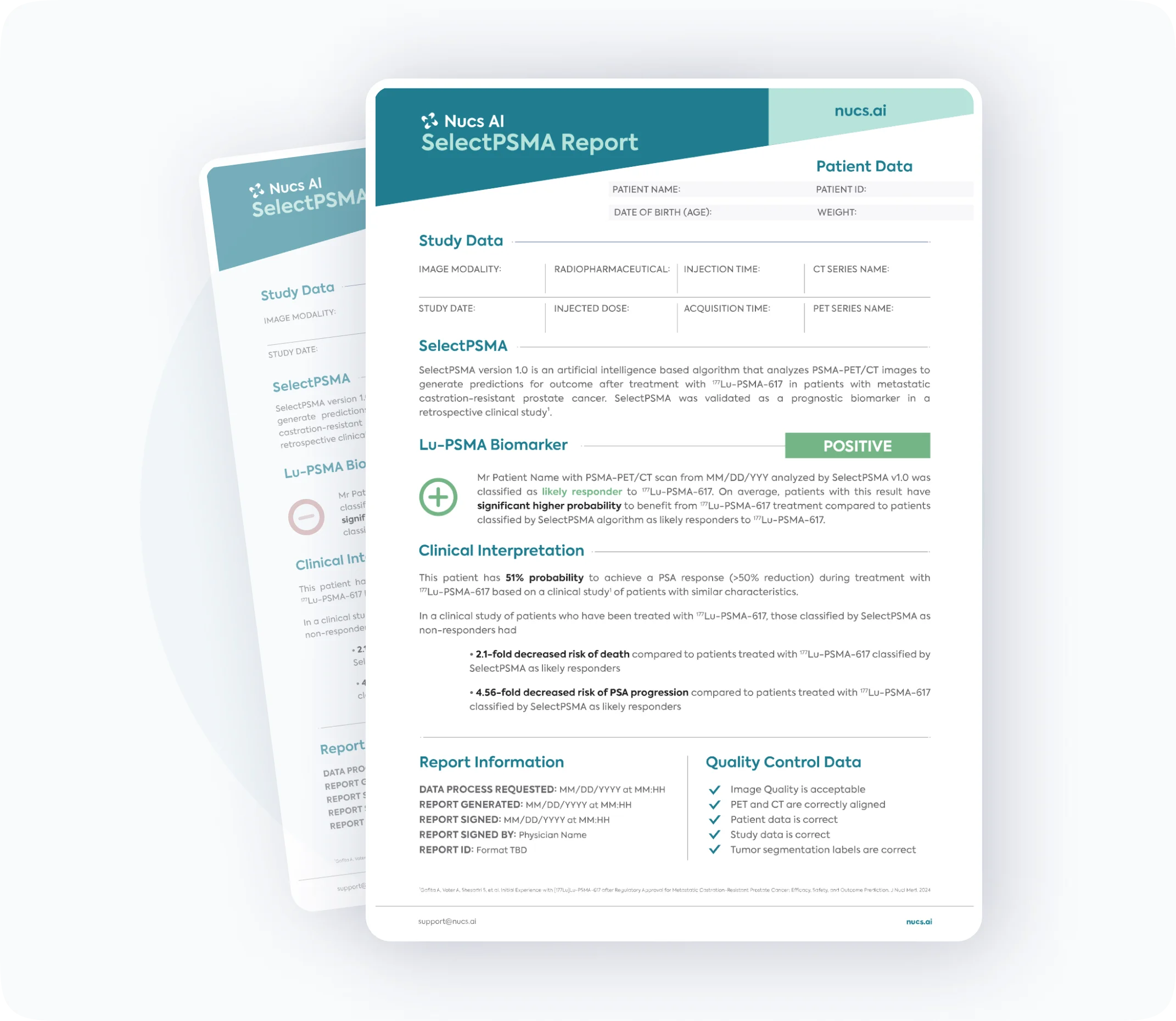 SelectPSMA analyzes whole-body tumor characteristics to predict response to PSMA-targeted radioligand therapy, empowering clinicians with greater confidence in patient selection, reducing ineffective treatments, and driving more personalized prostate cancer care.